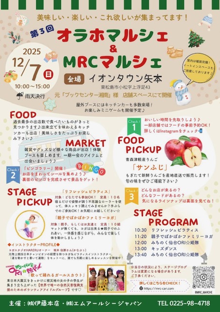 オラホマルシェ MRCマルシェ mrc mrcトータルマシンプロデュース  mrcトータルライフアシスト  ラポールヘアイオンタウン矢本店  クリスマス  12月イベント#東松島イベント#石巻イベント 矢本 イオンタウン矢本 マルシェ 冬のマルシェ キッチンカー ハンドメイドイベント ワークショップ 家族でおでかけ 親子イベント 地域イベント 冬のおでかけ グルメイベント ステージイベント サンふじ 産地直送 リフレッシュピラティス 親子ヨガ ダンスステージ 東松島市 石巻市